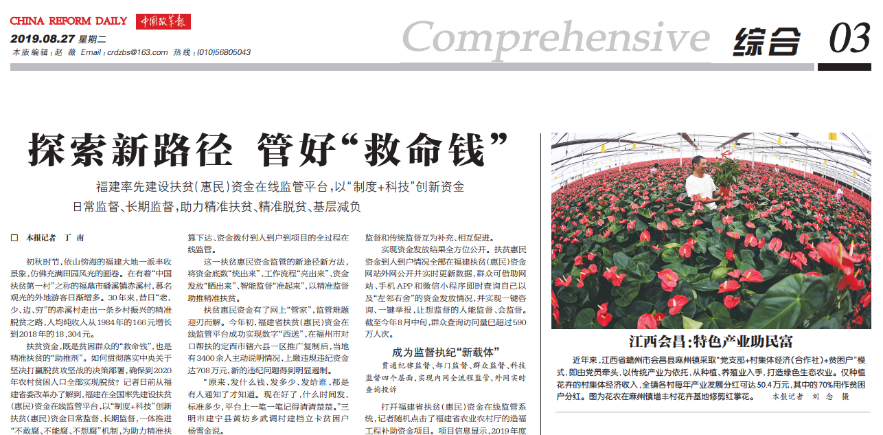 福建率先建设扶贫(惠民)资金在线监管平台,以“制度+科技”创新资金日常监督、长期监督,助力精准扶贫、精准脱贫、基层减负