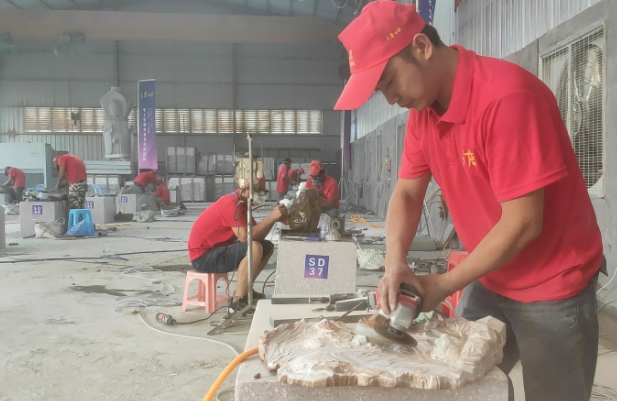 图为惠安霞飞石雕工艺有限公司技术总监张惠波在认真创作。