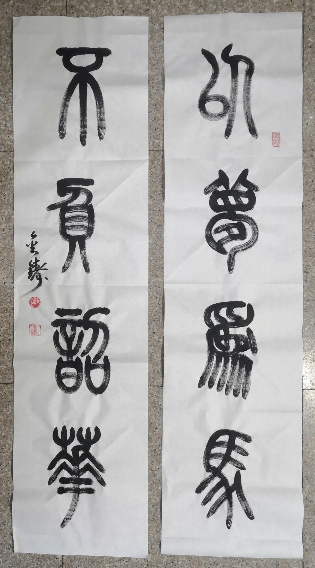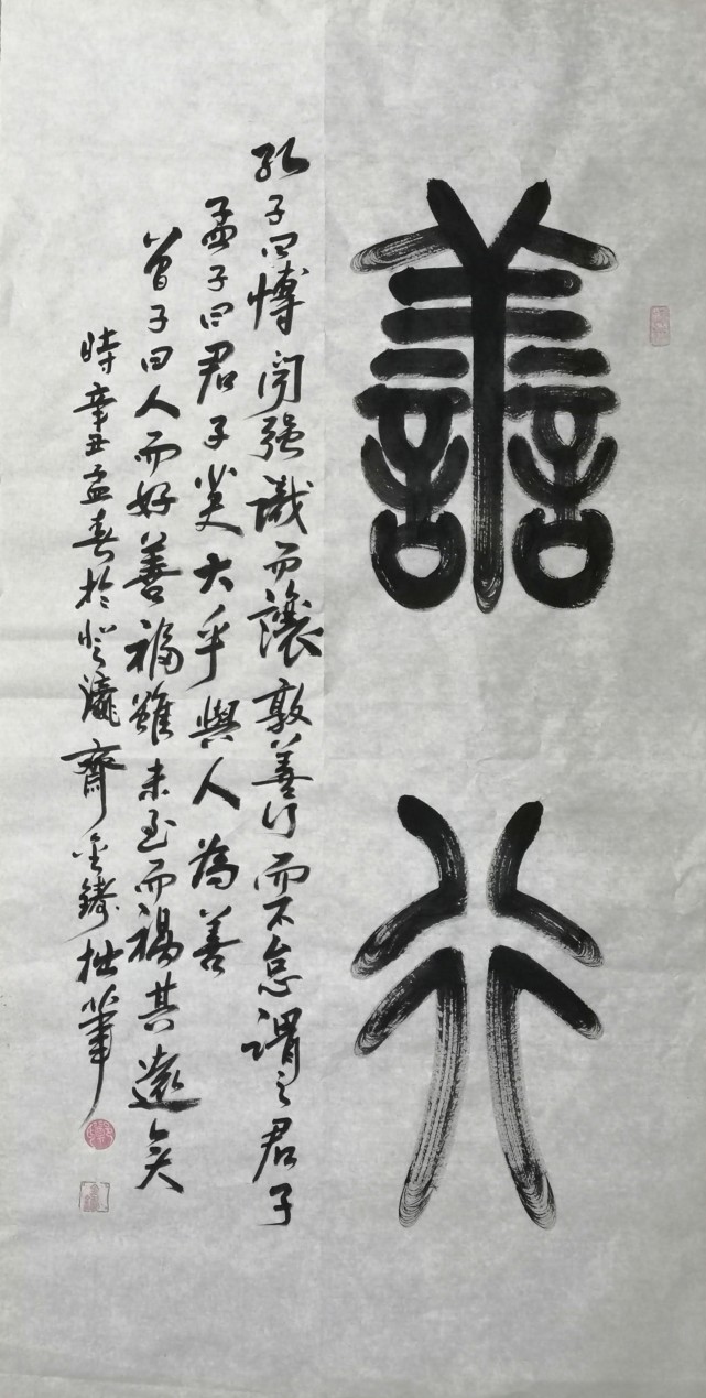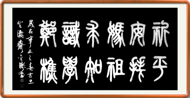 笔法对一幅作品来说,是起到了关键性的作用,笔法不深,则字形不臻。所以说,若是没有至深的笔墨功底,那么一切的文化基础和创作招式也就无法完美地展现出来,最后成为纸上谈兵罢了。故今日在欣赏先生的篆书作品中,我们仍能看到他那扎实的书法功底,而与隶书作品不同的是,在篆书作品中先生是融入了一些自我的个性和品韵。先生作篆,笔法时而盘屈遒劲,刚柔兼备,时而稳行稳止,凝练有度,用墨更是依据篆笔之势而定,参笔之迅疾长短,墨随之枯湿浓淡,二者可谓相辅相成,相辉相映!在结体和章法方面,先生是尚求于雍雅大方的一面,通幅篆体少见左低右高之形,而多深具正中之态,结体亦是则松似紧,独有非凡韵味!