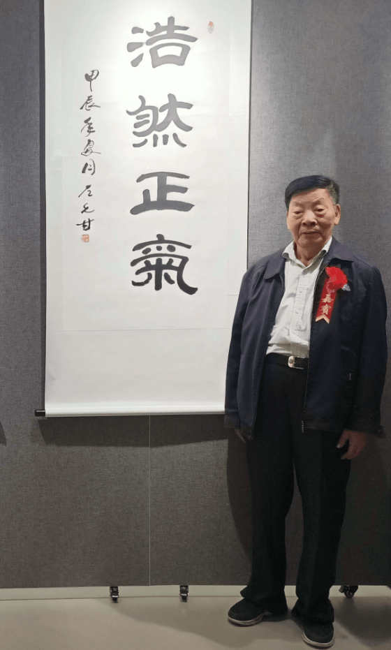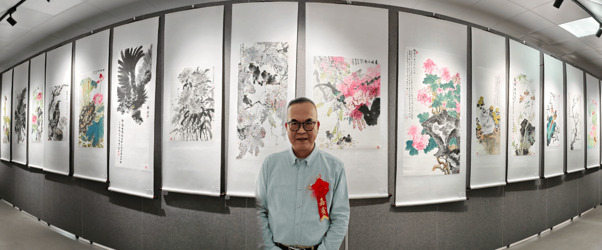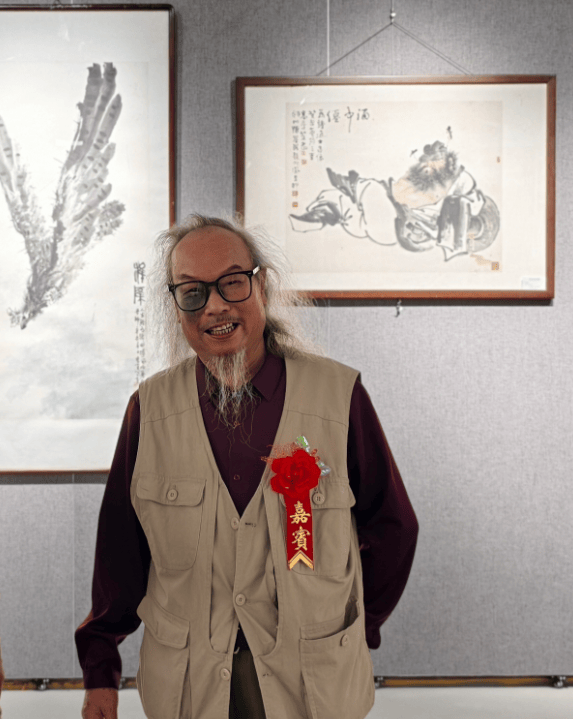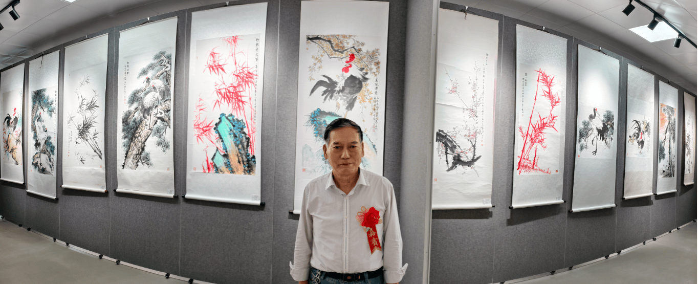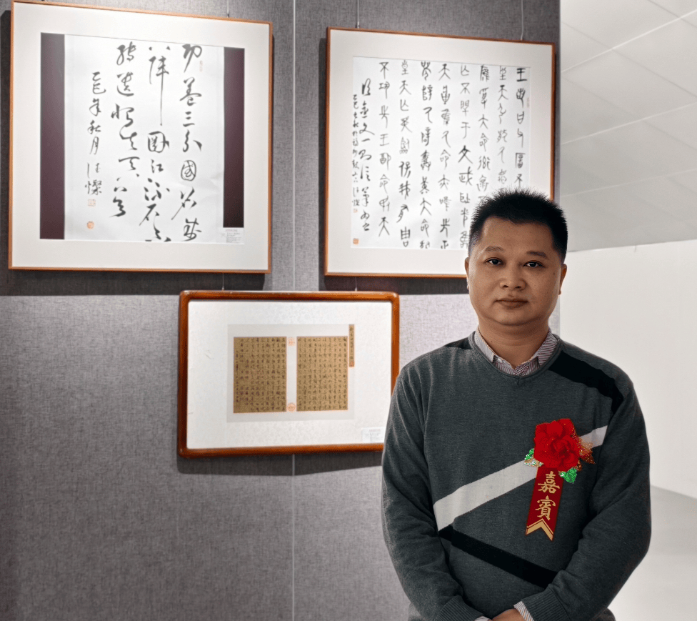 图为陈孝铤(朝潼)在他的参展作品前合影。
