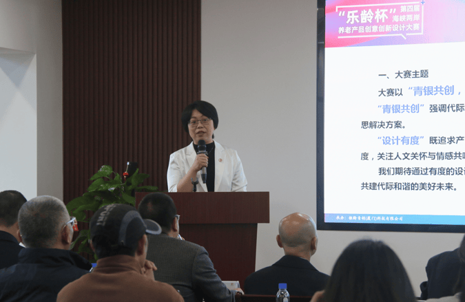 图为福州大学厦门工艺美术学院教授洪歆慧介绍两岸大学生养老产品创意设计大赛活动。