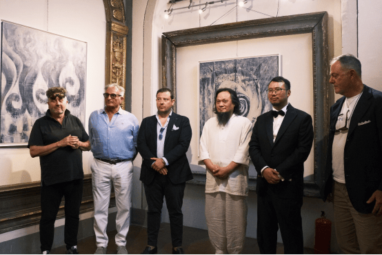 图为从左至右依次为:知名艺术家赫克托-安赫克托(Hector-And Hector)、圣马力诺共和国文化顾问斯特法诺·比加利(Stefano Bigalli)、 赫斯提亚画廊创始人安德烈亚·贝特罗(Andrea Betro)、中国当代著名画家吴轲阳、中方策展人吴昌孛和托斯卡纳银行基金会主席亚力山大·普齐(Alessandro Pucci)。