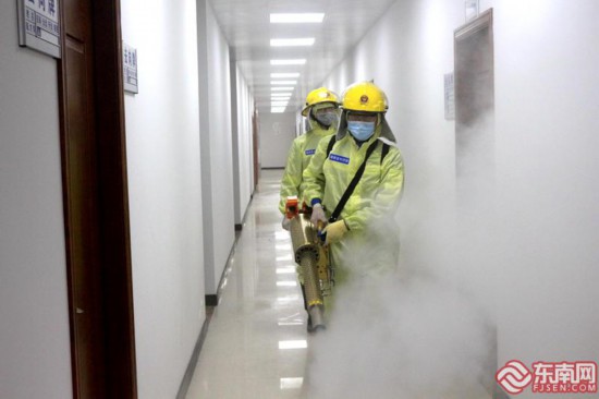 16日,小雨转晴。在仓山区科技园内,机器轰鸣马达声不断传来,一名身着防护服、戴着护目镜的福建蓝豹救援服务队队员,手提着弥雾喷枪,消毒水呈雾状从枪口中“吐”出来。这是福建蓝豹救援服务队和福建永传助残扶贫公益服务中心组织的志愿服务队走进福州市仓山区科技园,在园区内开展清洁消杀工作,服务复工复产企业的疫情防控。