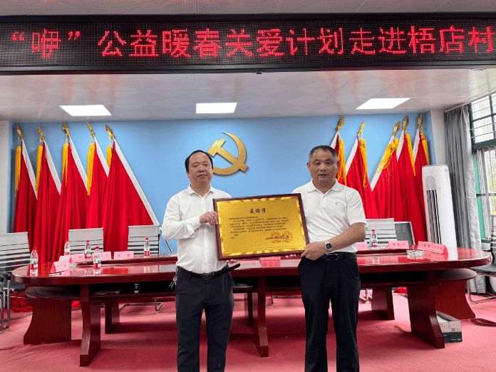 图为梧店村委会主任林开越(右)向本次活动支持单位授牌。