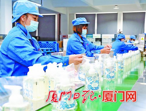 翔安海达日用品有限公司暂停生产主营产品,转产酒精喷雾、消毒水和免洗洗手液等,为防控疫情作贡献。(厦门日报社全媒体记者王火炎摄)