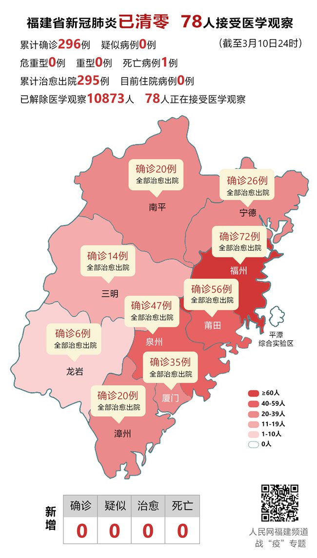 人民网福州3月11日电(陈蓝燕)据福建省卫健委网站消息,3月10日0—24时,福建省报告新增新型冠状病毒肺炎确诊病例0例。